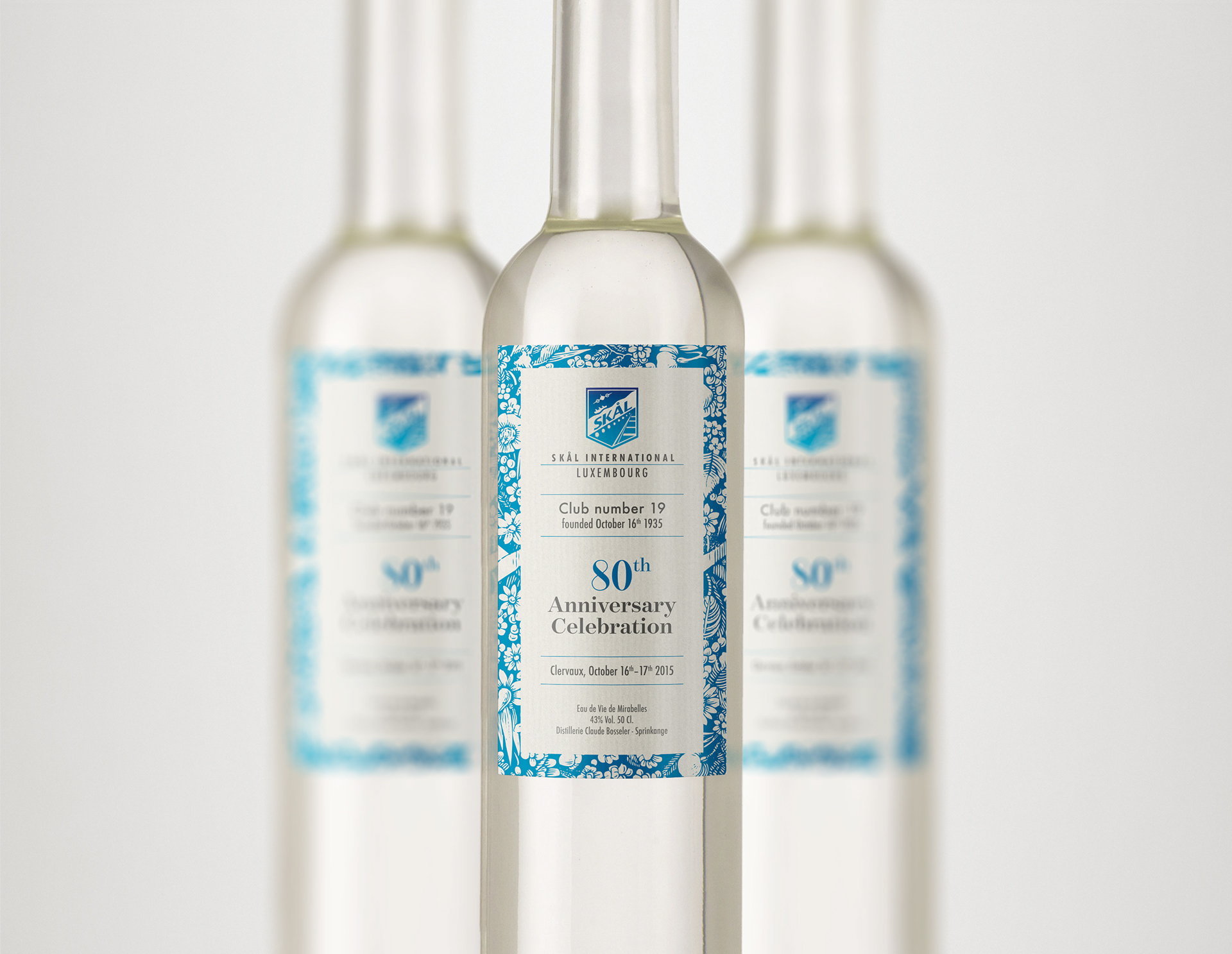 BOTTLE LABEL 80th Anniversary special edition liquor bottle for Skål International Luxembourg, Club number 19.